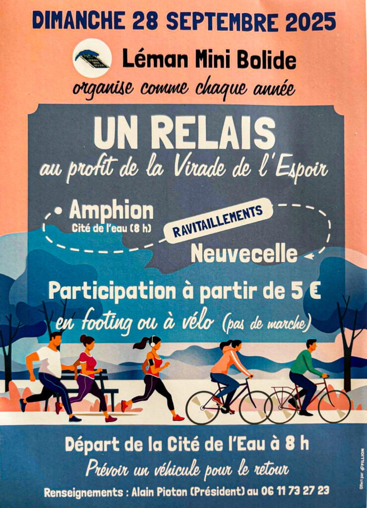 Comme chaque année, l’association Léman Mini Bolide se mobilise aux côtés de la Virade de l’Espoir en organisant un relais sportif entre la Cité de l’Eau et la commune hôte.